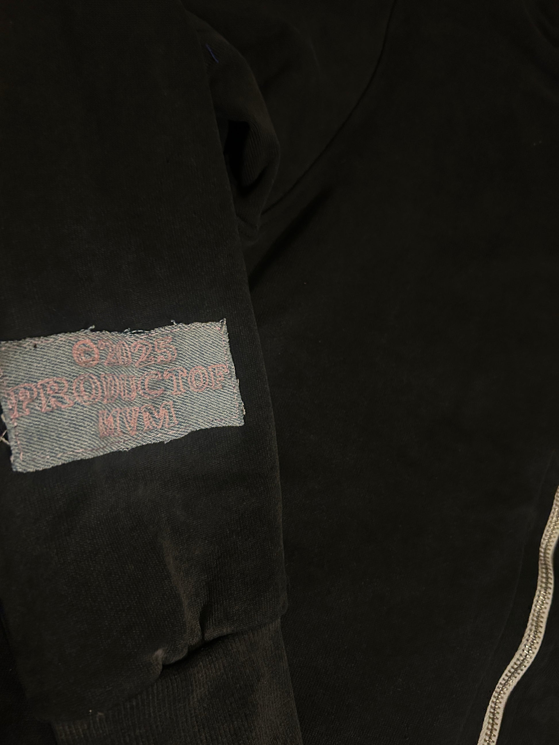 Hood with metal zipper at top, as well as pockets.
